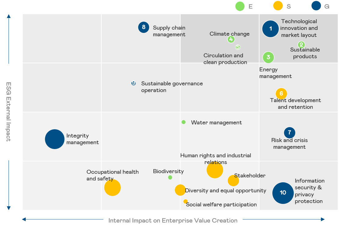 Assessing the relevance of issues based on global sustainability trends and GRI guidelines involves using surveys to understand stakeholders' concerns regarding the company's environmental, social (including human rights), and corporate governance aspects. A dual materiality assessment method is established to evaluate the operational impact of ESG issues on the company, with key partners in the company's value chain. External sustainability development impacts are evaluated based on the GRI Universal Standards 2021, integrating methodologies developed by the Value Balancing Alliance and the Harvard Business School's Impact-Weighted Accounts research project. This framework constructs an impact-based analysis process to identify material topics.