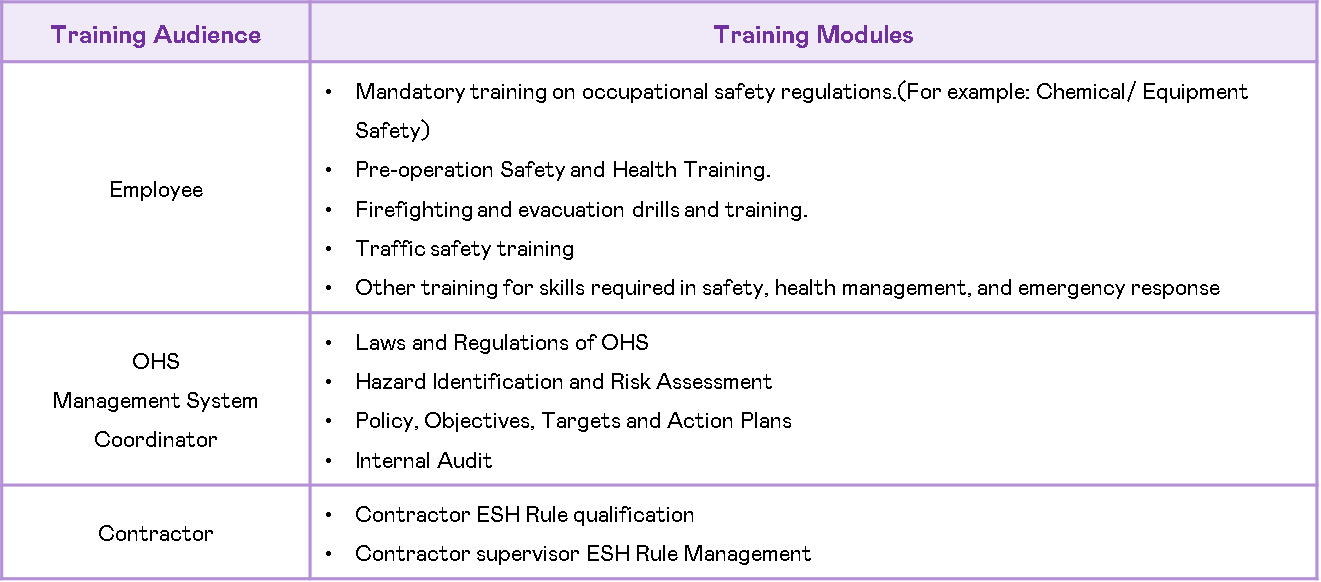 To equip employees with the knowledge and skills related to workplace occupational safety, health, and management issues, provide necessary training on management systems, occupational safety and health, fire safety, and emergency response. Additionally, effectively utilize resources to align employees' growth with the company's sustainable development goals.