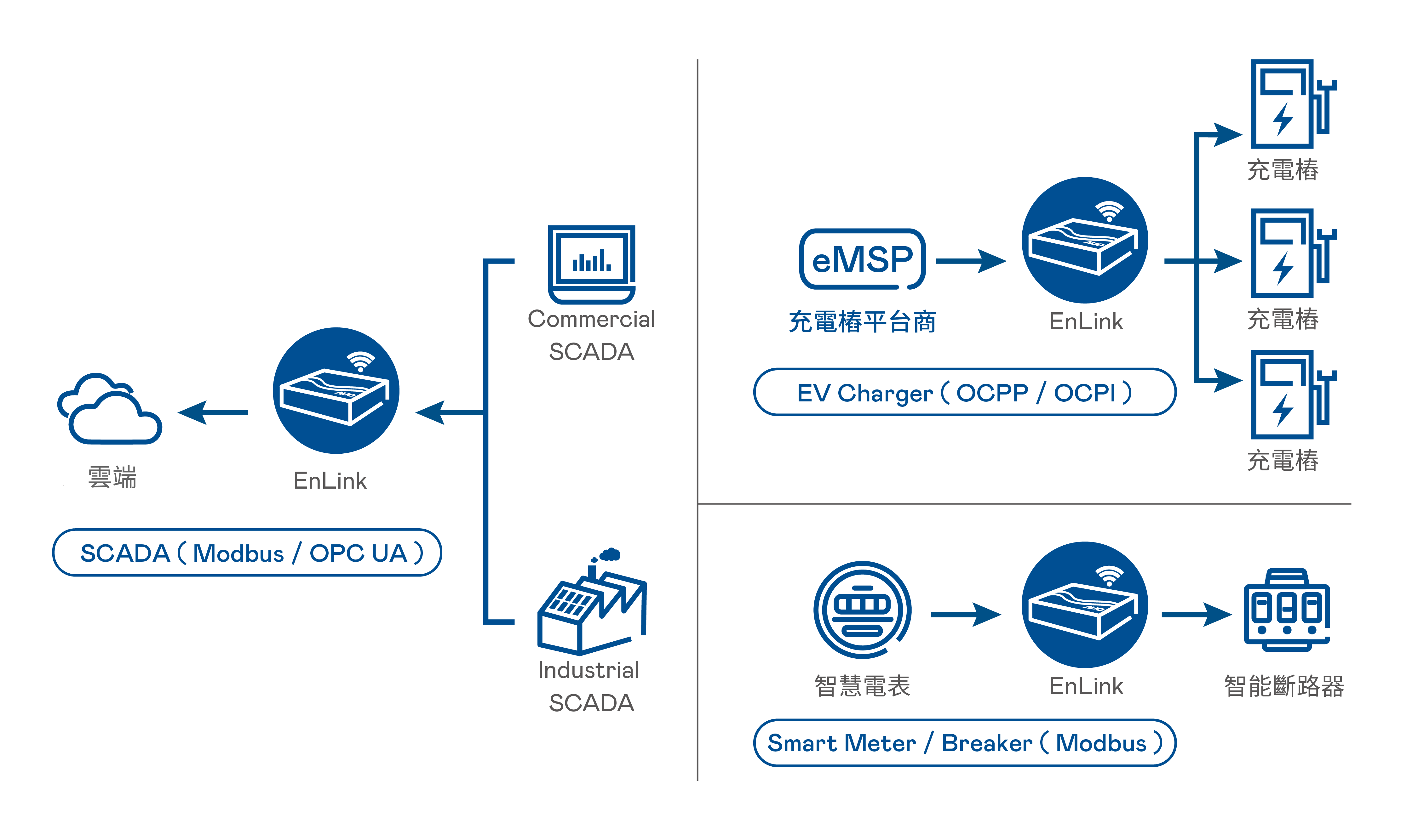 「EnLink」使用工業級輕量硬體設備,擁有強大且多元化的通訊傳輸介面,包含Modbus TCP/RTU與Sensor、智慧迴路開關或儲能設備介接,將多個端點的資料收集通訊協定標準化,支援4G國際標準通訊協議,可即時上傳場域能耗、市電與再生能源電量等相關能源資訊。透過OCPP國際標準通訊協議與各式EV Charger充電樁溝通,結合PV及ESS可實現光充儲案場自動需量調控能源管理模式。
