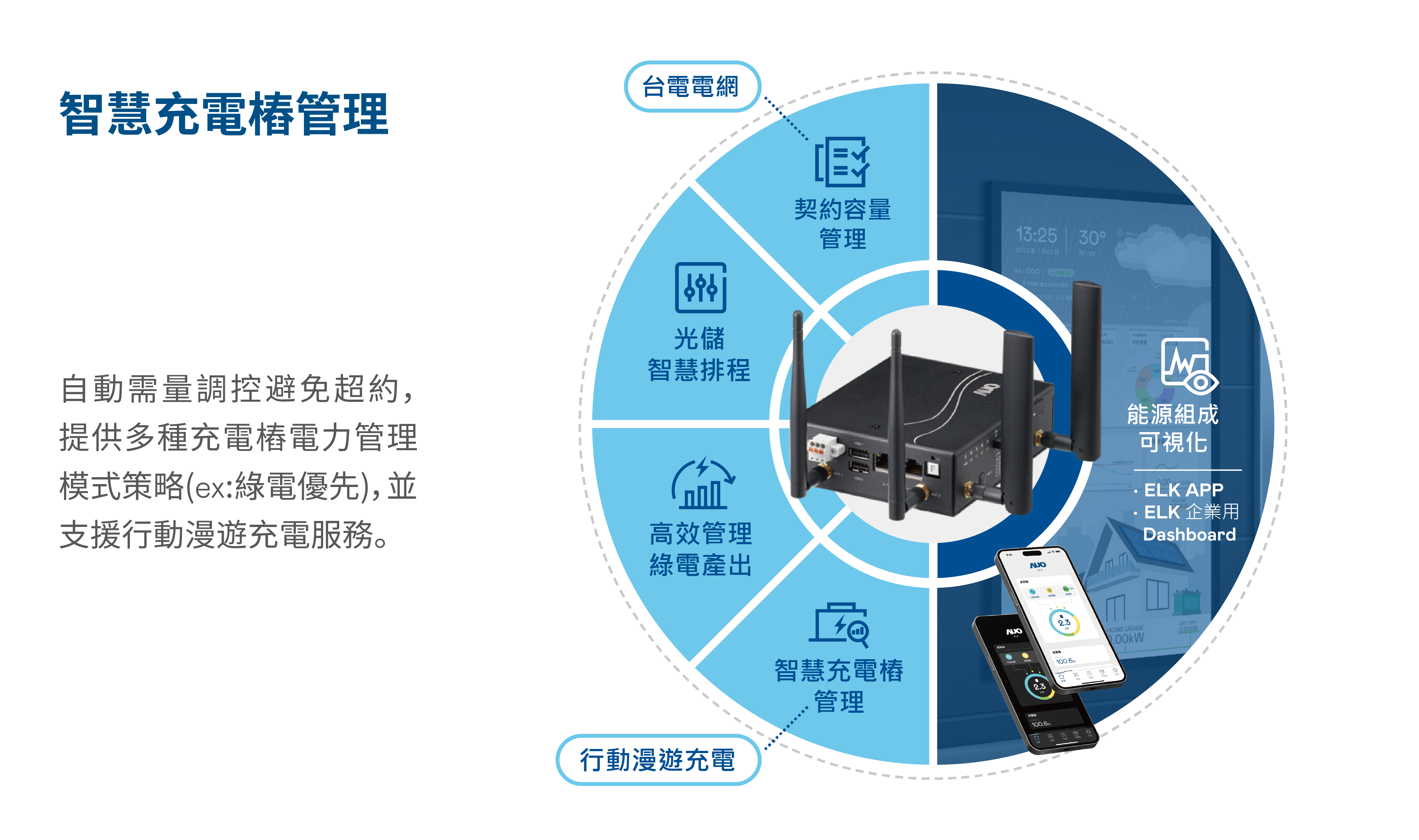 ELK Dashboard展示系統可提供企業總部ESG能源管理展示,監測電力耗能、儲能調度、充電樁監控並與再生能源結合管理,以可視化的能源組成分析簡化能源決策,優化能源效率,並確保能源使用符合發展目標。