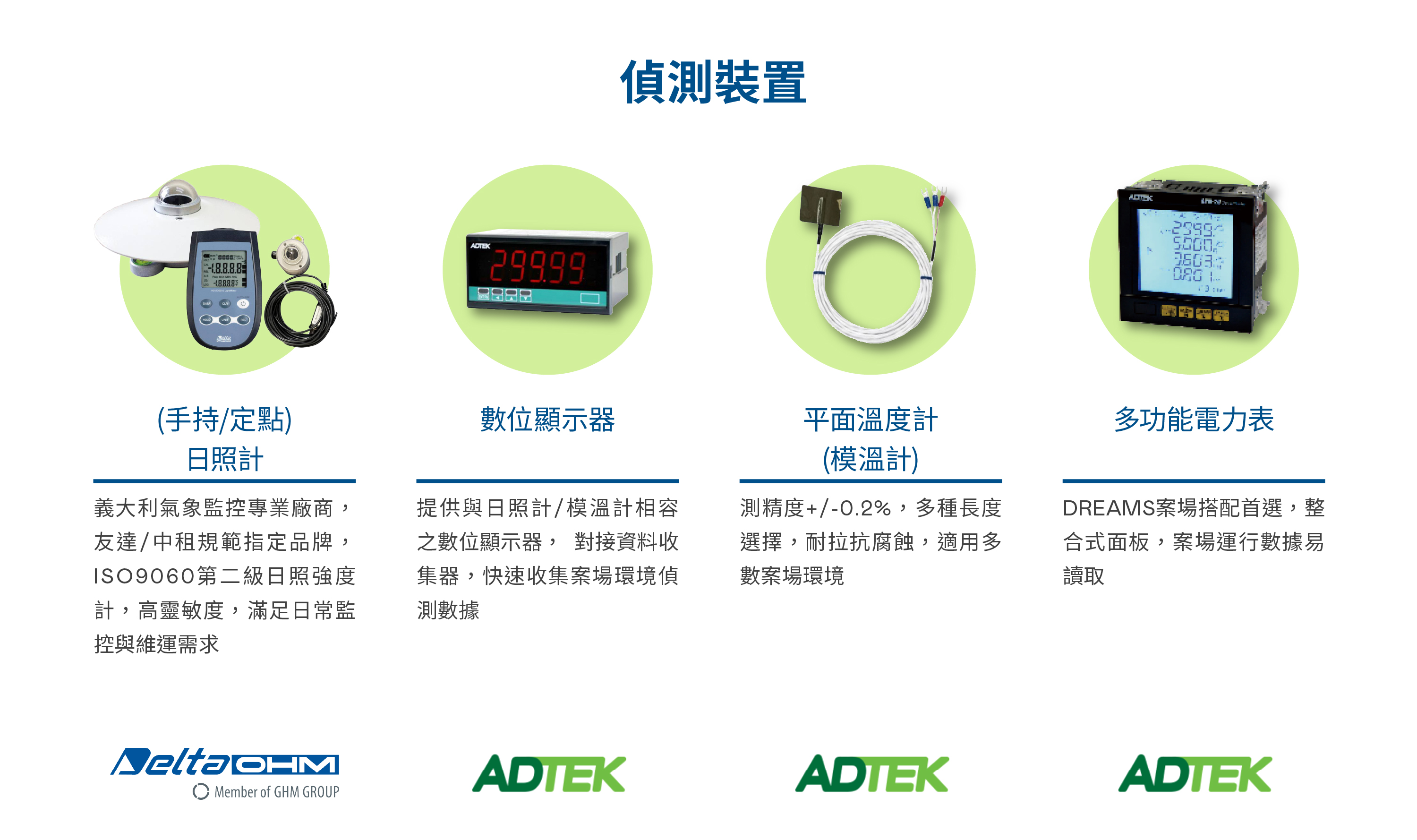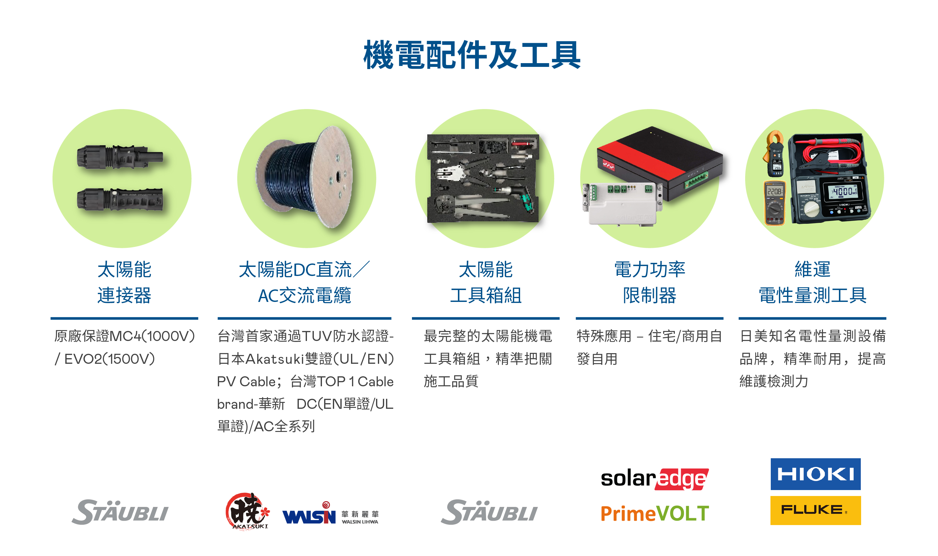 在「一站式購足」服務範疇下,非凡娛樂除自有太陽能模組及監控監控軟硬體整合方案外, 同時提供客戶太陽能電廠其它的可靠優質零組件品牌與產品,包含電廠的重要組件如變流器、連接器、電線電纜、環境偵測裝置及相關輔佐材料與工具。